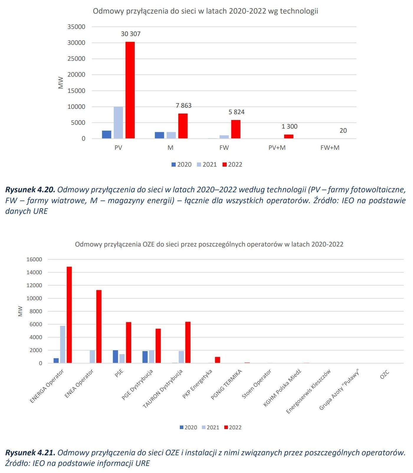 IEO wylicza, że łączna moc projektów, którym odmówiono przyłączenia, sięga 45 GW. Dla porównania, aktualna moc farm wiatrowych w Polsce to 9,7 GW, a fotowoltaiki – 13,8 GW. Dla rozwoju energetyki odnawialnej to fatalne wieści. Jak podsumowuje IEO, w 2022 r. moc projektów, które spotkały się z odmową, była prawie sześć razy większa od mocy tych z warunkami przyłączenia. Oznacza to, że choć było zainteresowanie budową i instalacją nowych OZE, to ze względu na ograniczenia sieciowe, nie można było tego zrobić.
