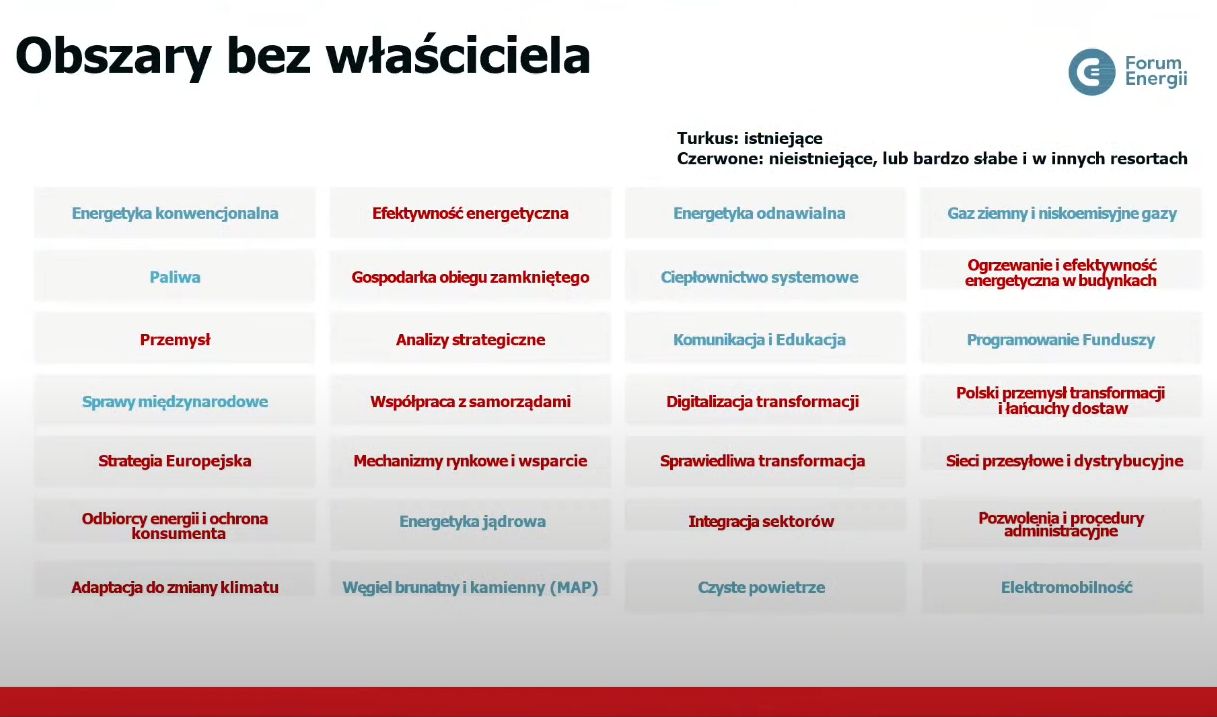 Jak mówiła szefowa think tanku Joanna Pandera, jednym z największych problemów transformacji w Polsce jest skuteczna koordynacja działań. – Wiele z tematów, którymi trzeba się obecnie zająć, nie ma odniesienia w administracji centralnej – powiedziała. Forum zaprezentowało „obszary bez właściciela”, którymi nie zajmuje się nikt, lub resort inny niż Ministerstwo Klimatu i Środowiska. Są to między innymi efektywność energetyczna, sprawiedliwa transformacja czy współpraca z samorządami.