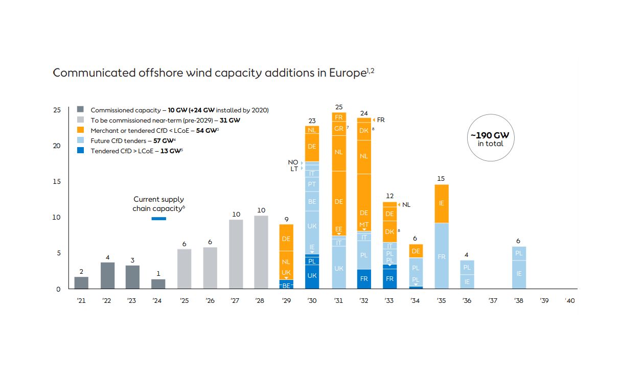 Bez współpracy i podejmowania działań na rzecz synergii sektorowi offshore wind grozi impas. Dlatego branża domaga się, aby co roku 10 GW nowych mocy w offshore wind było zabezpieczane kontraktami CfD, a kolejne 5 GW – było oddawane „na rynek” bez takiego zabezpieczenia. Byłby to ogromny skok, gdyby udało się oddawać tyle mocy rocznie. Pod koniec 2024 r. w Europie było łącznie 37 GW mocy w offshore wind, z czego 21 GW w Unii Europejskiej.