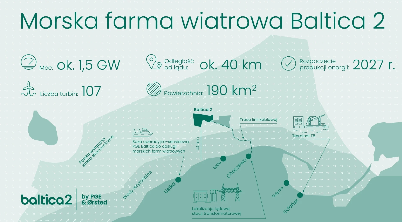 Baltica 2 będzie największą morską farmą wiatrową w Polsce i jedną z największych w Europie. Realizacja tak ambitnego przedsięwzięcia wymagała strategicznego partnerstwa na najwyższym szczeblu – współpracy Ørsted, globalnego lidera w obszarze morskiej energetyki wiatrowej, oraz Polskiej Grupy Energetycznej, największego podmiotu na krajowym rynku elektroenergetycznym. Do obsługi tej inwestycji PGE powołała spółkę PGE Baltica. Odpowiada ona za cały proces: od dewelopmentu i kontraktowania, przez nadzór nad budową, aż po przyszłą, wieloletnią fazę operacyjną morskiej farmy wiatrowej.